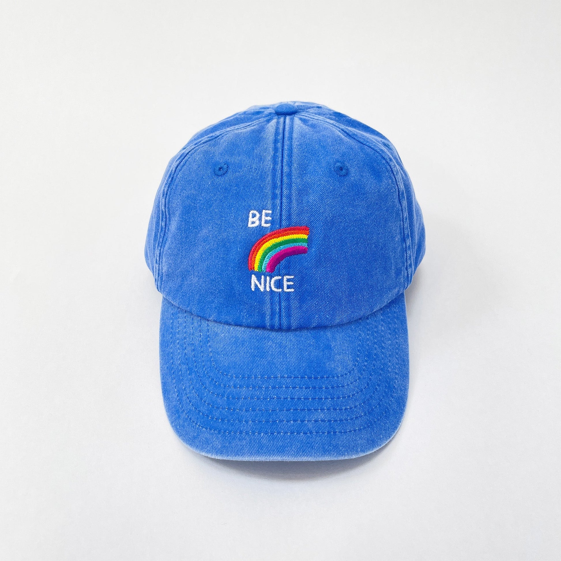 A vintage blue denim cap with Be Nice rainbow artwork embroidery. Adapted and designed from the iconic limited edition screenprint: